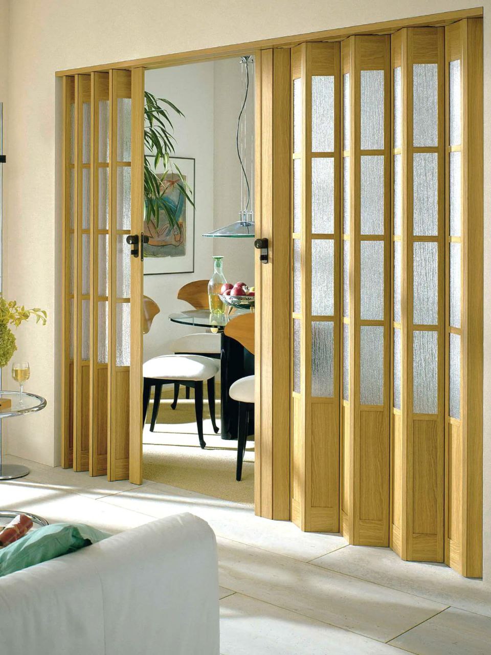 Сразу следует оговориться – этот вариант не отличается надёжностью. Прописанного запрета на использование подобных дверей нет, но на практике проверяющие очень неохотно дают разрешение на такую перегородку.